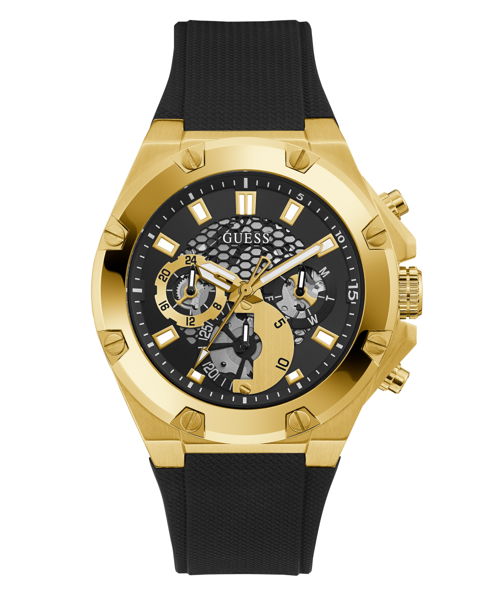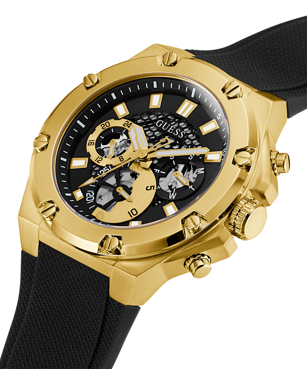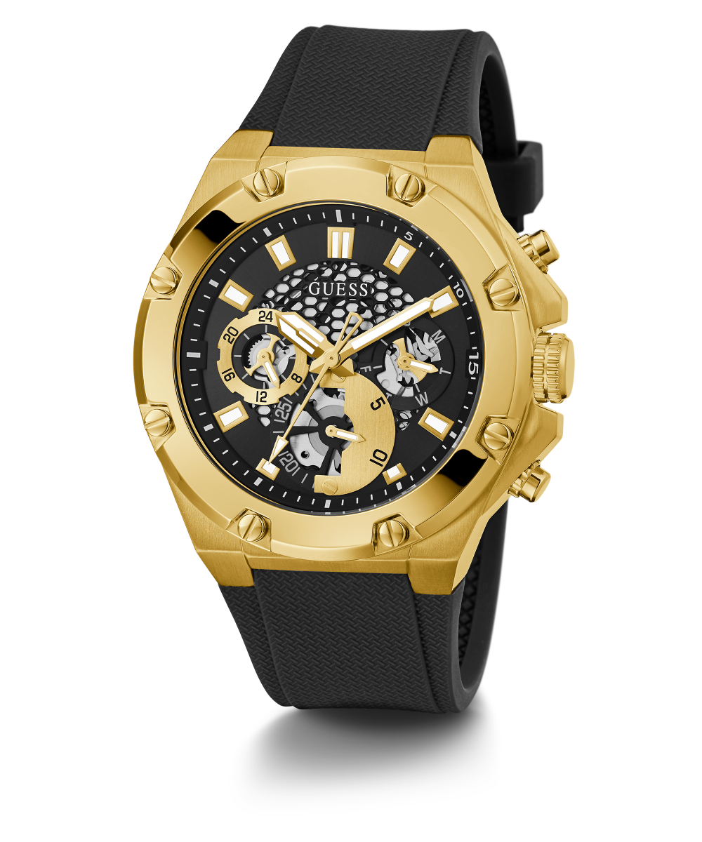 Shift into third gear with our sport style that has sophisticated screw detailing on the bezel and cut through details on the dial giving us a glimpse of the movement. This style is paired with a black silicone strap.