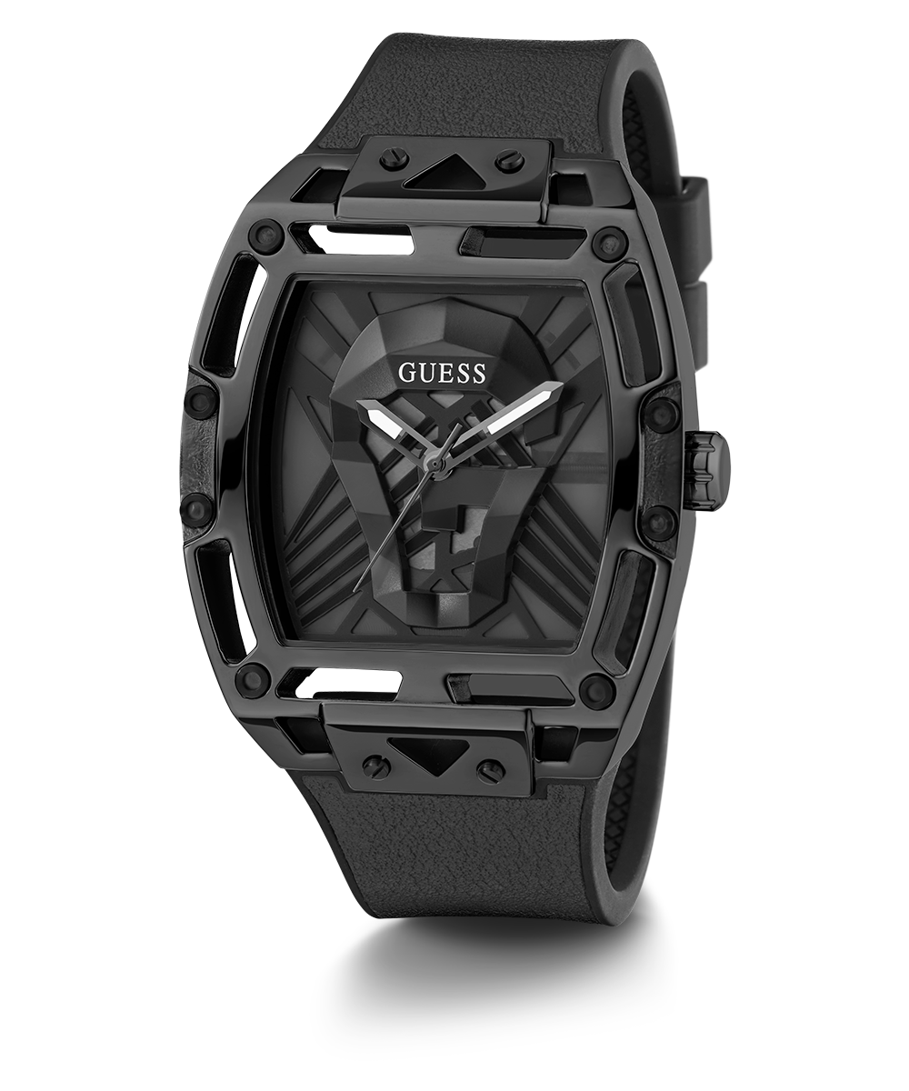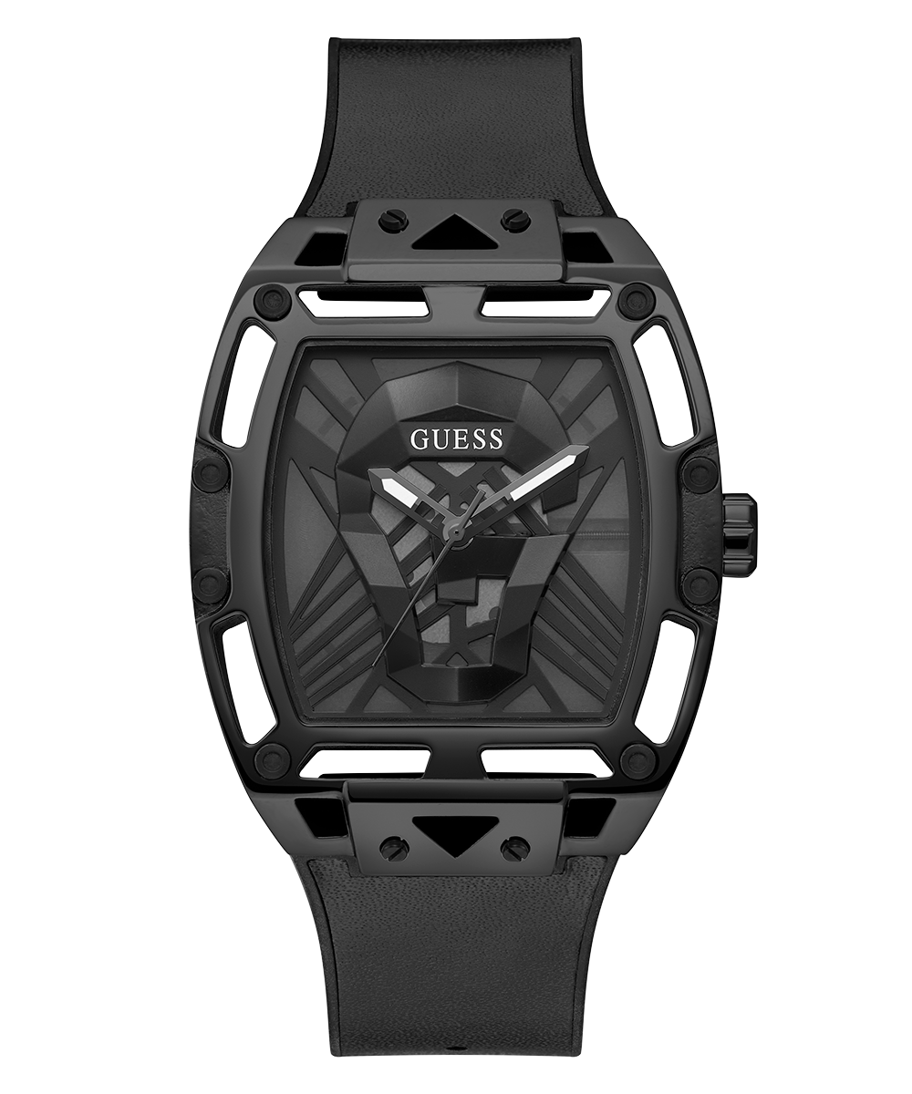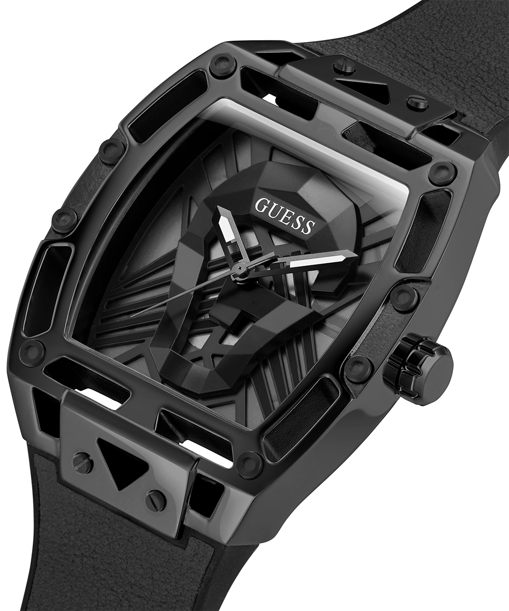 The cut-thru design and translucent case and dial details on this men's style are legendary. Featuring a cut thru dial with screw details and a translucent black dial with a G skull in the center with a smooth black leather strap on flex black silicone.