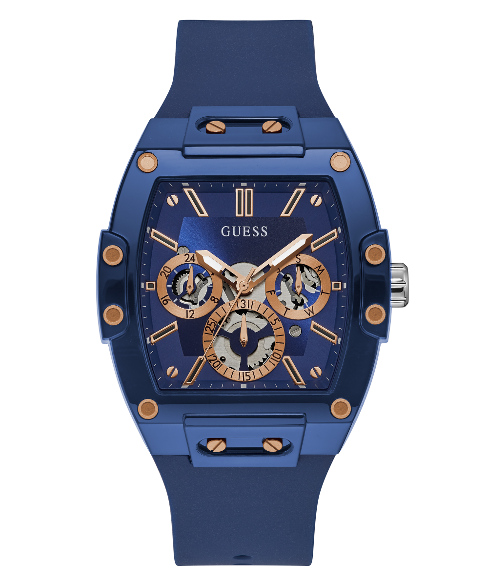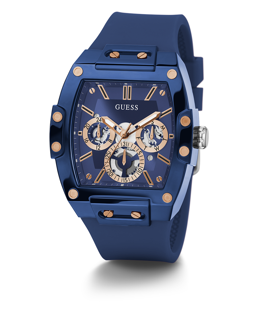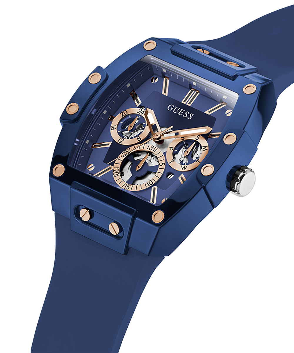 Skeleton dial details keep this phoenix on the rise. This style features a nylon barrel shaped case with rose gold screw details and a blue multi-function dial and rose gold accents paired with a blue silicone strap.